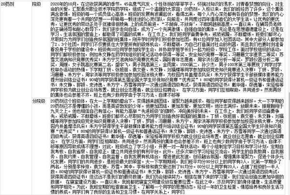 根据《泰州职业技术学院先进班集体创建工作实施细则》和《泰州职业技术学院院、分院两级先进班集体评选和奖励办法(试行)》的有关规定和要求,经班级申请、分院审核,拟推荐19药品经管注册、20生物、20药剂、20药安为分院级先进班集,20生物 20药剂为院级先进班集体。