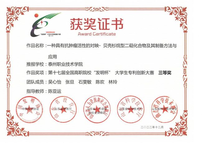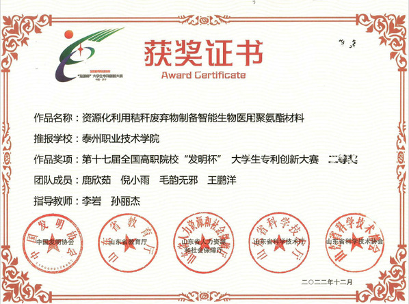 近日,药学院师生收到全国高职院校第十七届“发明杯”大学生专利创新大赛获奖证书。经过激烈角逐,药学院2个参赛项目全部获奖,鹿欣茹、倪小雨、毛韵无邪、王鹏洋4位同学的参赛作品《资源化利用秸秆废弃物制备智能生物医用聚氨酯材料》(指导教师:李岩博士、孙丽杰老师)斩获二等奖,吴心怡、张旦、石雯敏、陈欢、林玲5位同学的参赛作品《一种具有抗肿瘤活性的对映一贝壳杉烷型二萜化合物及其制备方法与应用》(指导教师:陈亚运博士)获得三等奖。