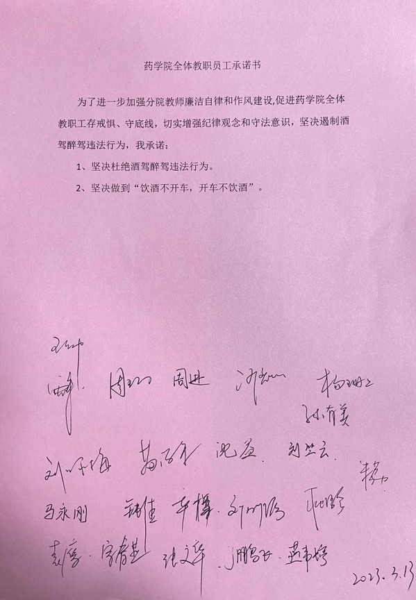 在专题警示教育会上,药学院党总支纪检委员曹晖领学了杜绝酒驾醉驾的微党课,包括案例、认定、处分、误区,告诫大家在日常工作中要进一步强化责任意识、红线意识、忧患意识。通过案例以案说法,用血淋淋的事故教育引导大家坚决克服侥幸心理,自觉做到遵纪守法。与会党员和全体教师展开热烈讨论,纷纷表示坚决杜绝酒驾与醉驾行为,做好表率。会后全体教师签署承诺书。