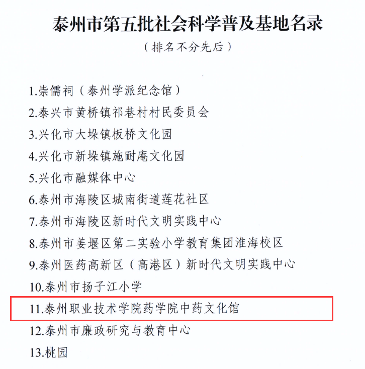 近日,泰州市哲学社会科学界联合会公布了第五批泰州市社会科学普及基地名单,药学院中药文化馆成功入选。