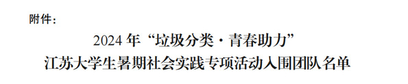 根据《关于开展“垃圾分类·青春助力”江苏大学生暑期社会实践专项活动的通知》相关要求,经团委推荐,团省委社会联络部(志工部)对各团队申报材料进行了综合评审,确定 “绘分类 靓凤城”青春助力垃圾分类志愿服务队入围 2024 年“垃圾分类·青春助力” 江苏大学生暑期社会实践专项活动。