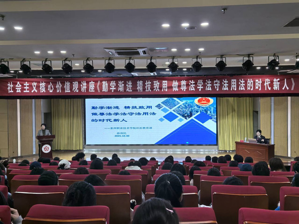 2025年10月30日,智能制药与化工新材料学院关工委在大学生活动中心105教室组织学生骨干积极参与“勤学渐进 精技致用 做尊法学法守法用法的时代新人”为主题的法治教育讲座。为深入培育和践行社会主义核心价值观,切实引导青年学生筑牢法治根基。
